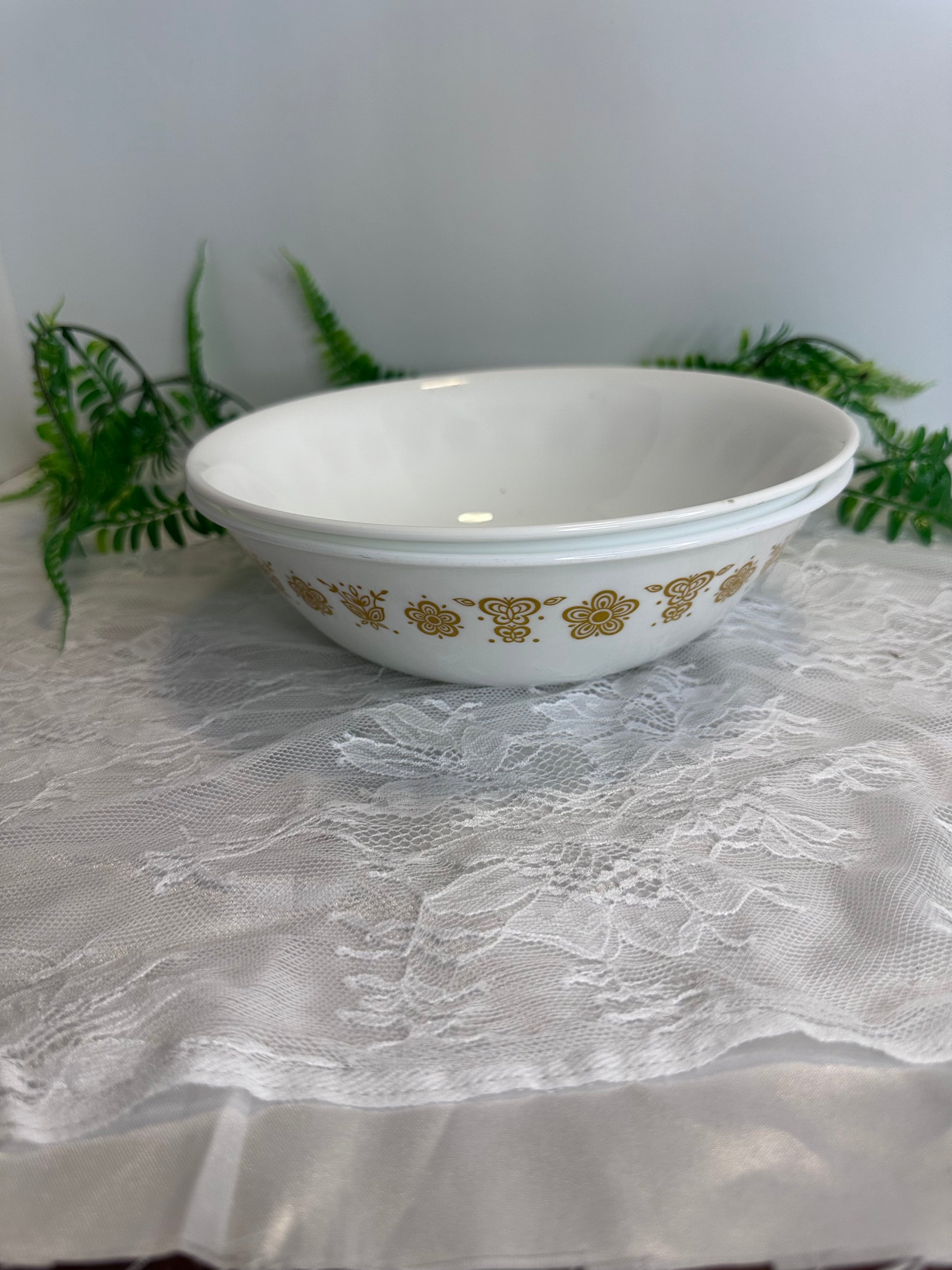 Upgrade your kitchen with this set of 2 Vintage Mid Century Corelle Butterfly Gold Soup Cereal Bowls. Made with lightweight yet durable Corelle material, these bowls are perfect for everyday use. The elegant butterfly gold pattern adds a touch of retro charm to any meal.
