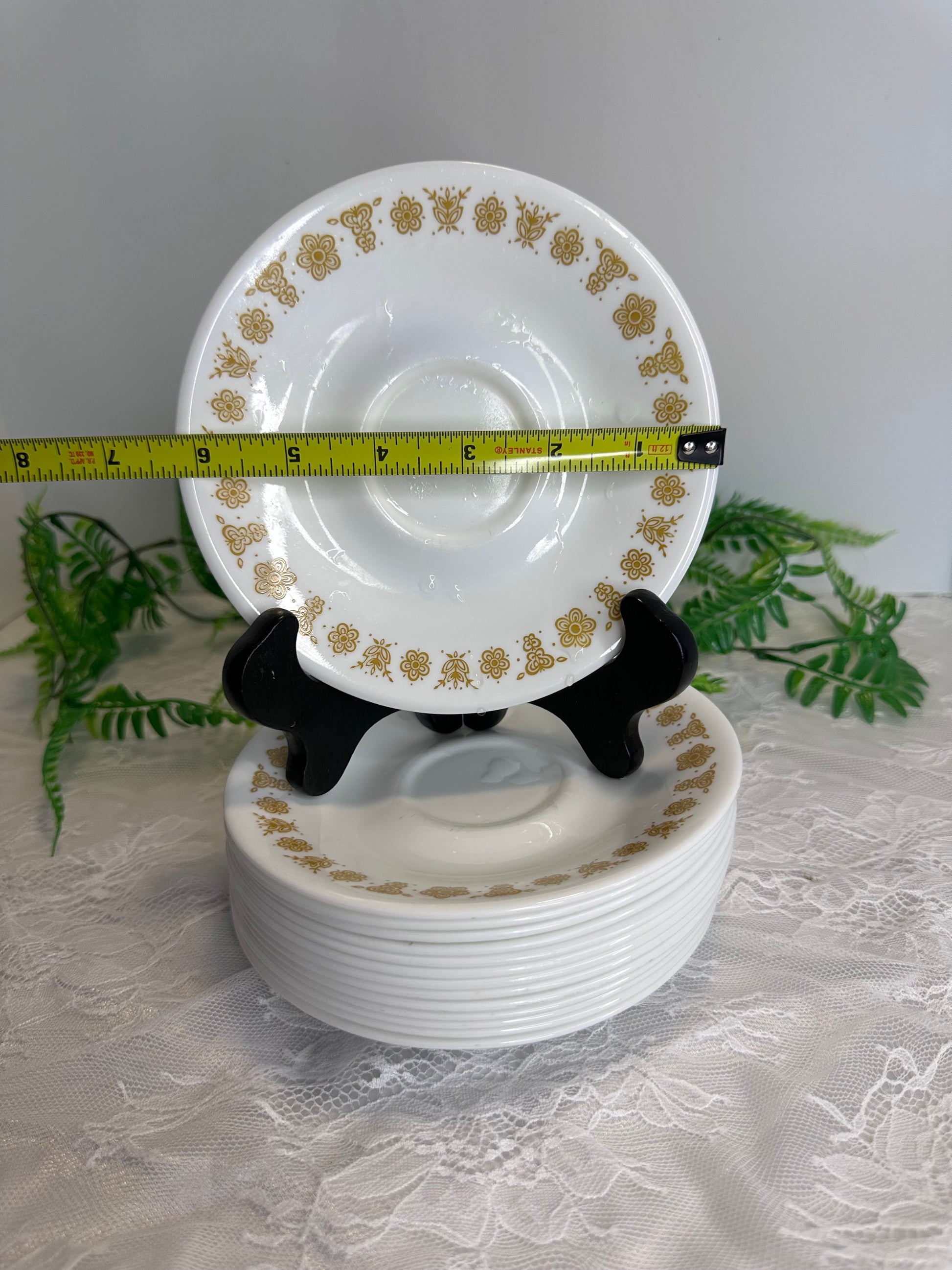 Corelle Butterfly Gold dinnerware is a timeless classic, featuring a popular 1970s pattern. These 14 saucer plates are made from durable Corelle material, ensuring long-lasting use. Elevate your dining experience with these stylish and nostalgic saucers.
