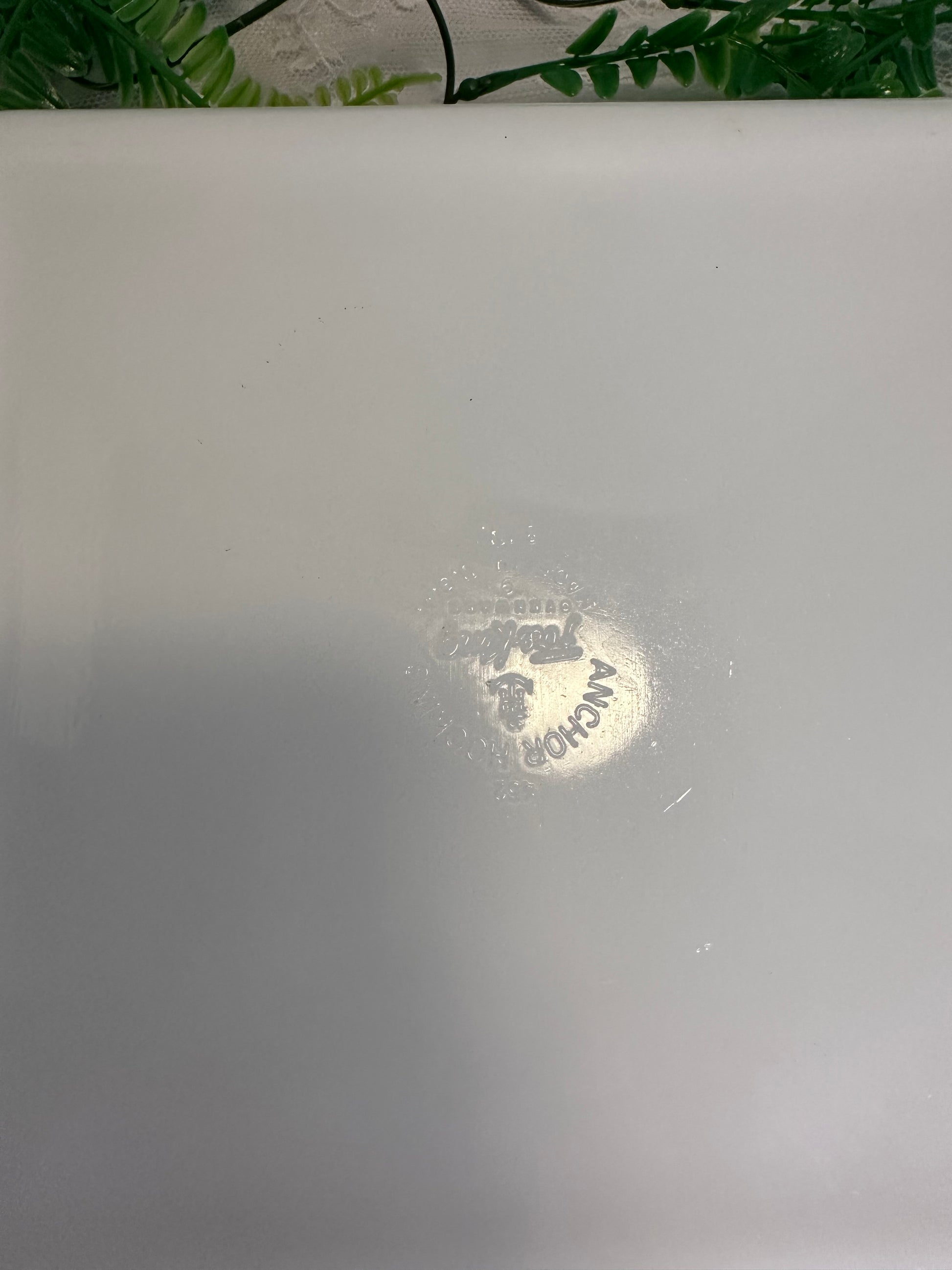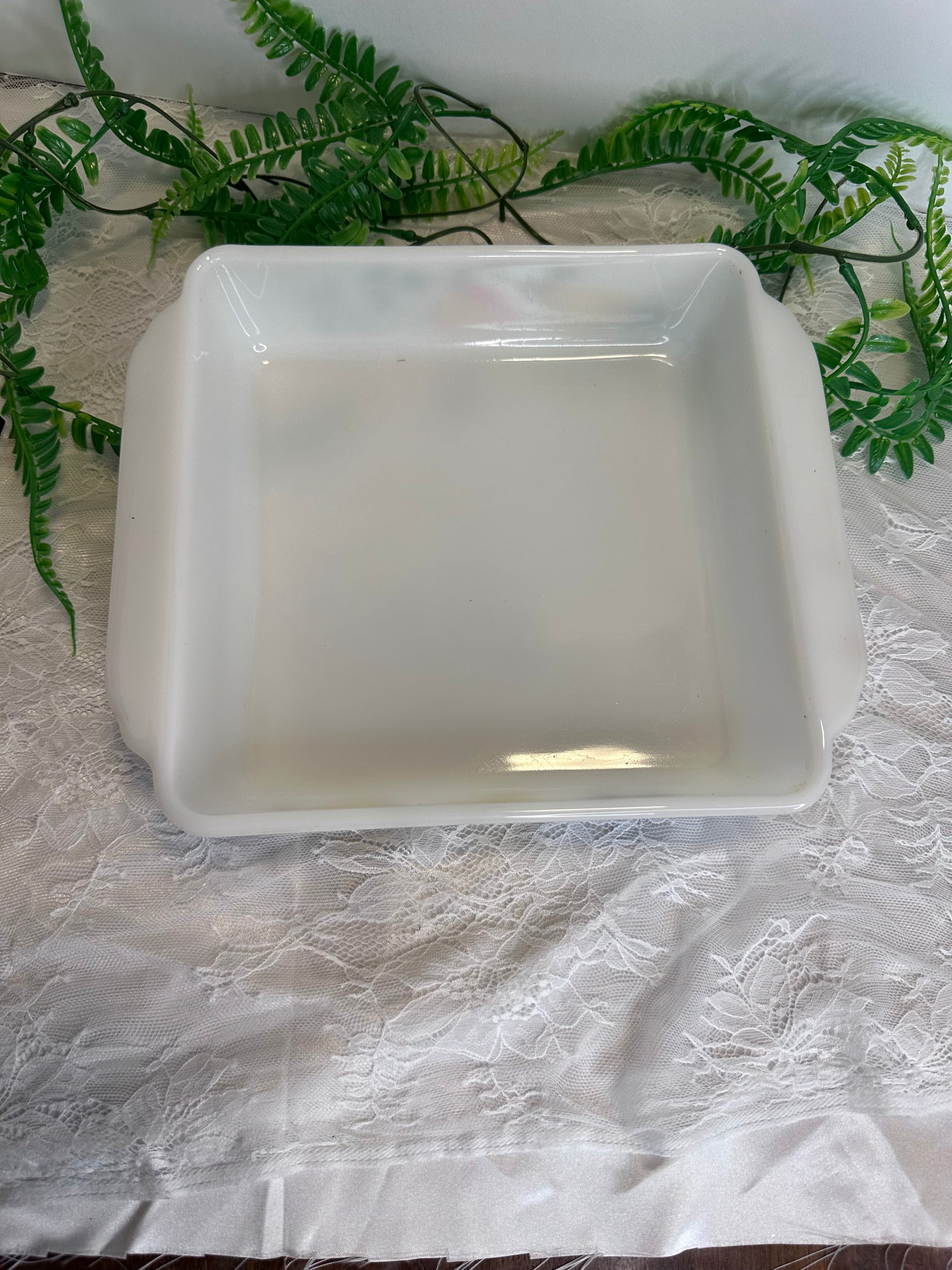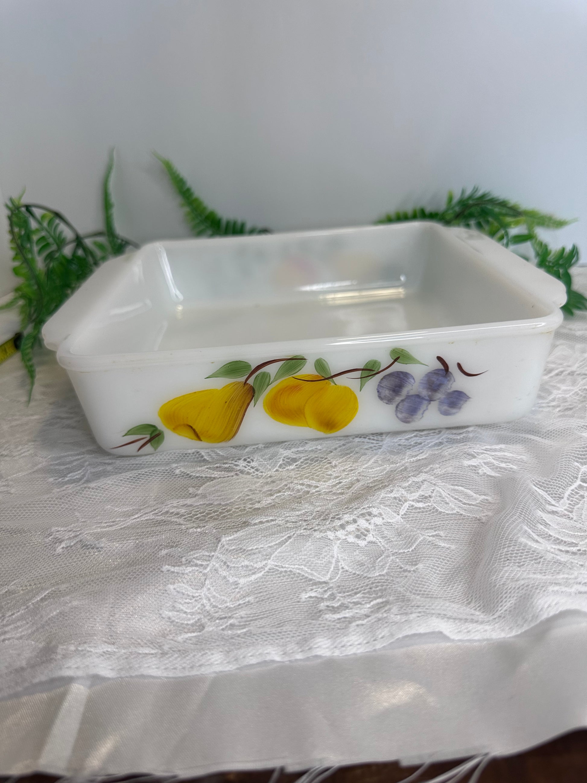 Introducing the vintage Anchor Hocking Fire King square milk glass baking dish, featuring a timeless "Gay Fad" fruit design. Crafted with high-quality materials and exquisite attention to detail, this dish is perfect for baking and serving delicious meals. Enhance your kitchen with this charming and functional piece.