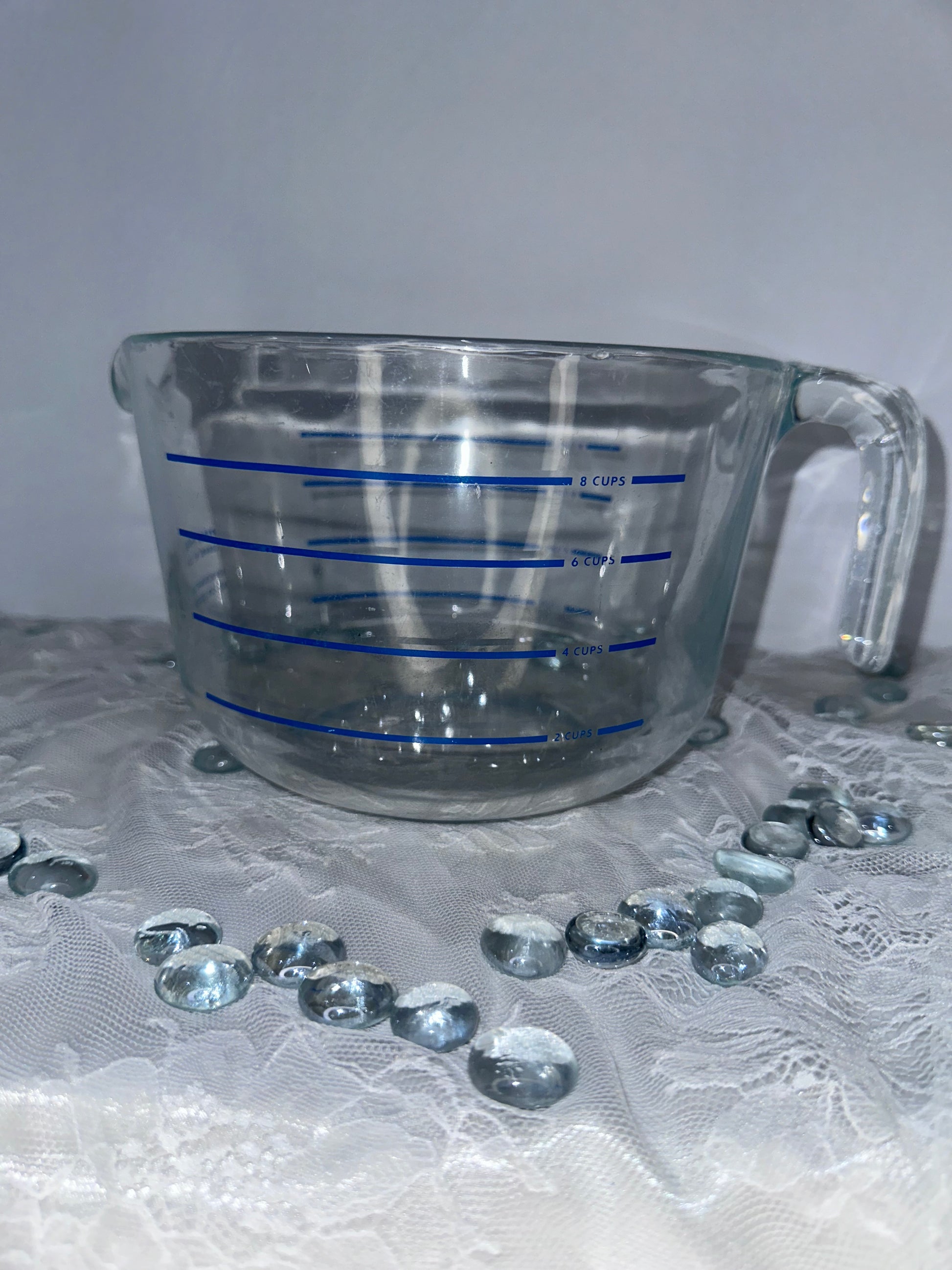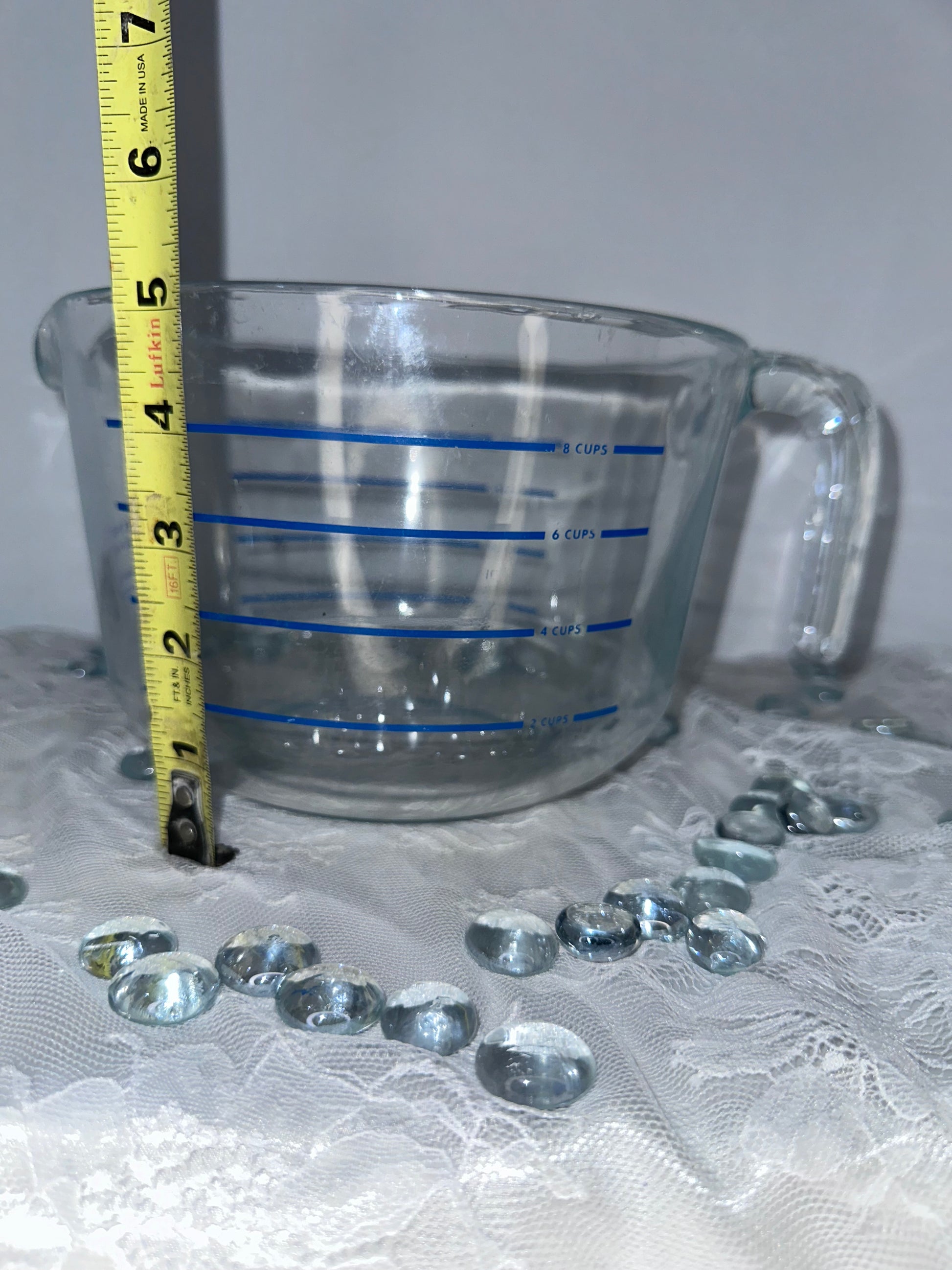 "Measure with ease using the PYREX M-640 Corning NY USA Measuring Bowl! This clear glass bowl features a sturdy handle and a blue stripe for a touch of style. With a capacity of 8 cups, it's perfect for all your baking and cooking needs. Get accurate measurements every time!"