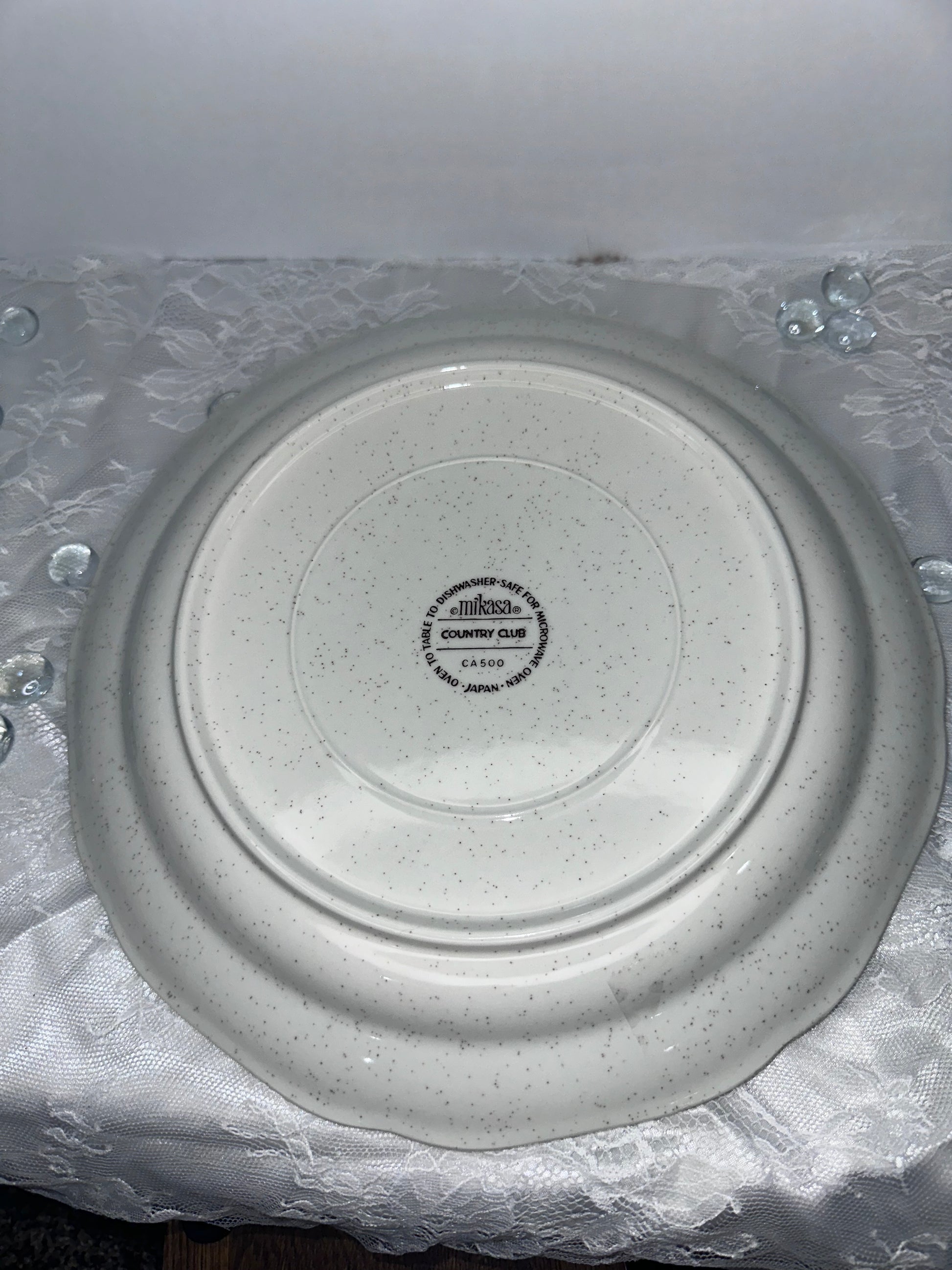 Enhance your dining experience with this set of 3 vintage Mikasa plates. Crafted with exquisite design and high-quality materials, these plates are sure to impress your guests. Add a touch of elegance to your table setting and elevate your meals with these timeless pieces.