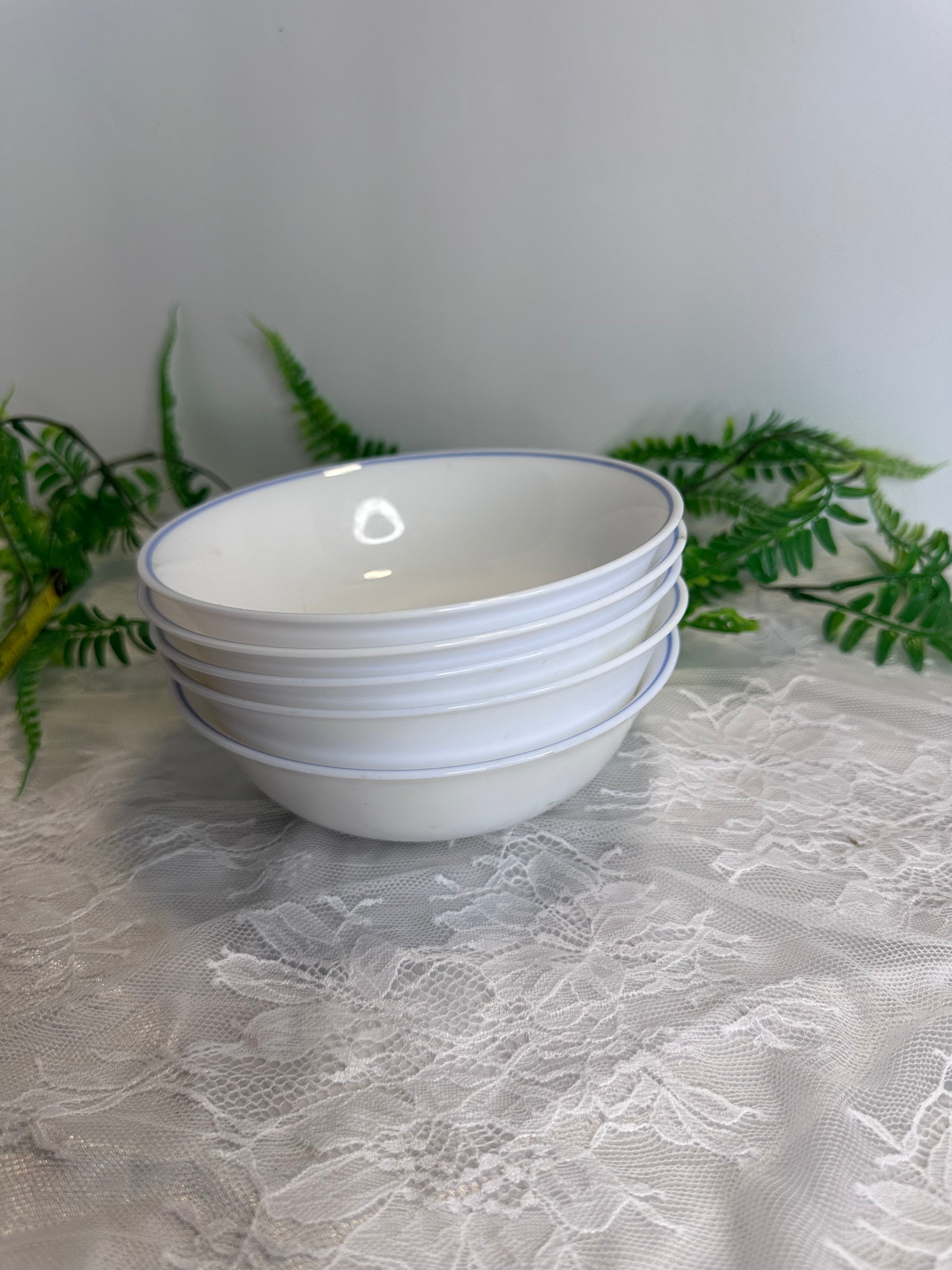 Experience the timeless elegance of our set of Vintage Arcopal Bowls. These classic white and blue bowls are perfect for serving soups, salads, and more. Made with durable and high-quality Arcopal glass, these bowls will add a touch of sophistication to any table setting. Set includes 5 bowls.