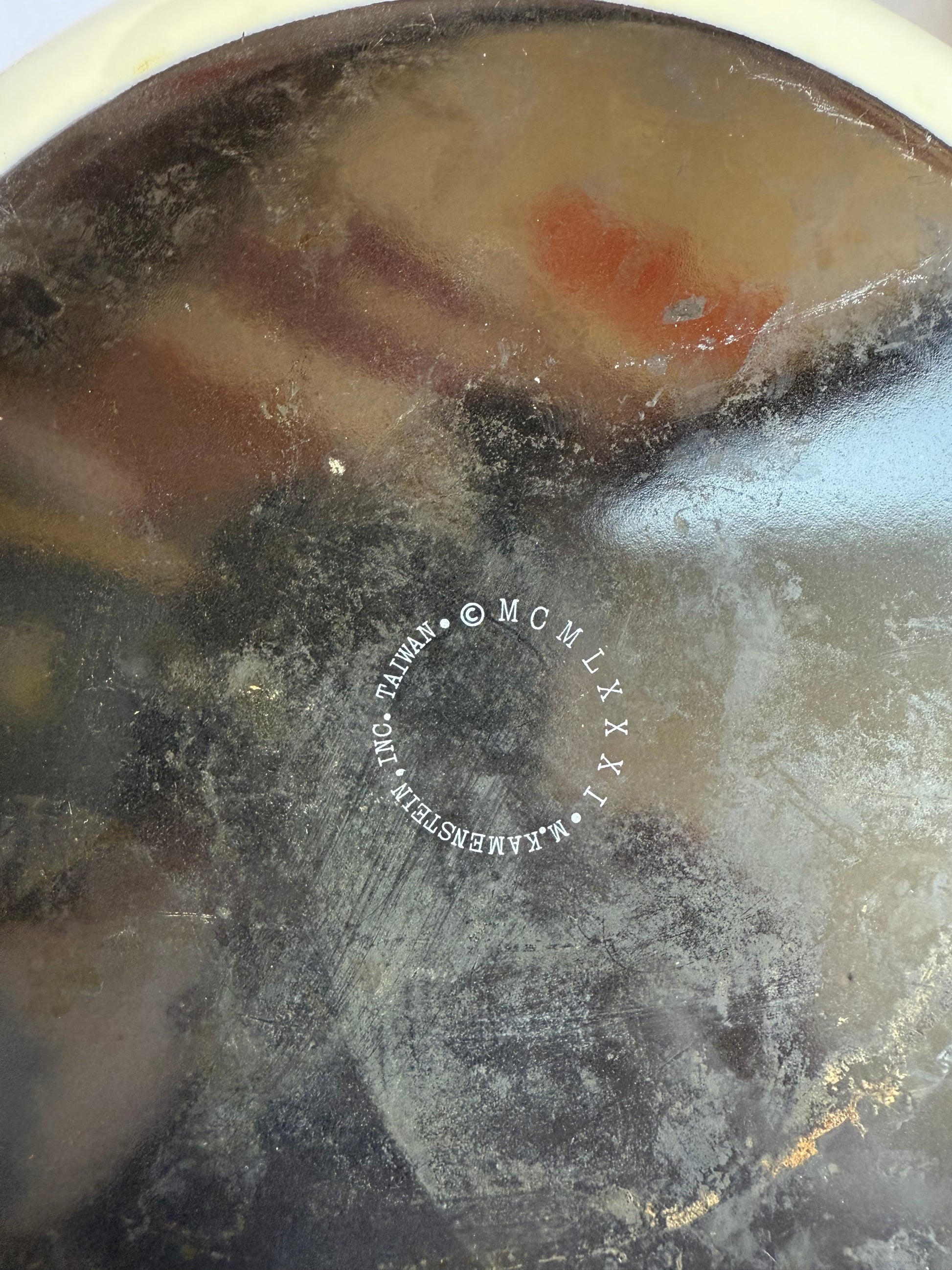 This vintage M. Kamenstein enamel pan with brass handles is a must-have for any kitchen. The high-quality enamel coating allows for easy cooking and cleaning, while the durable brass handles provide a solid grip. With its classic design and expert craftsmanship, this pan is sure to elevate your cooking experience.