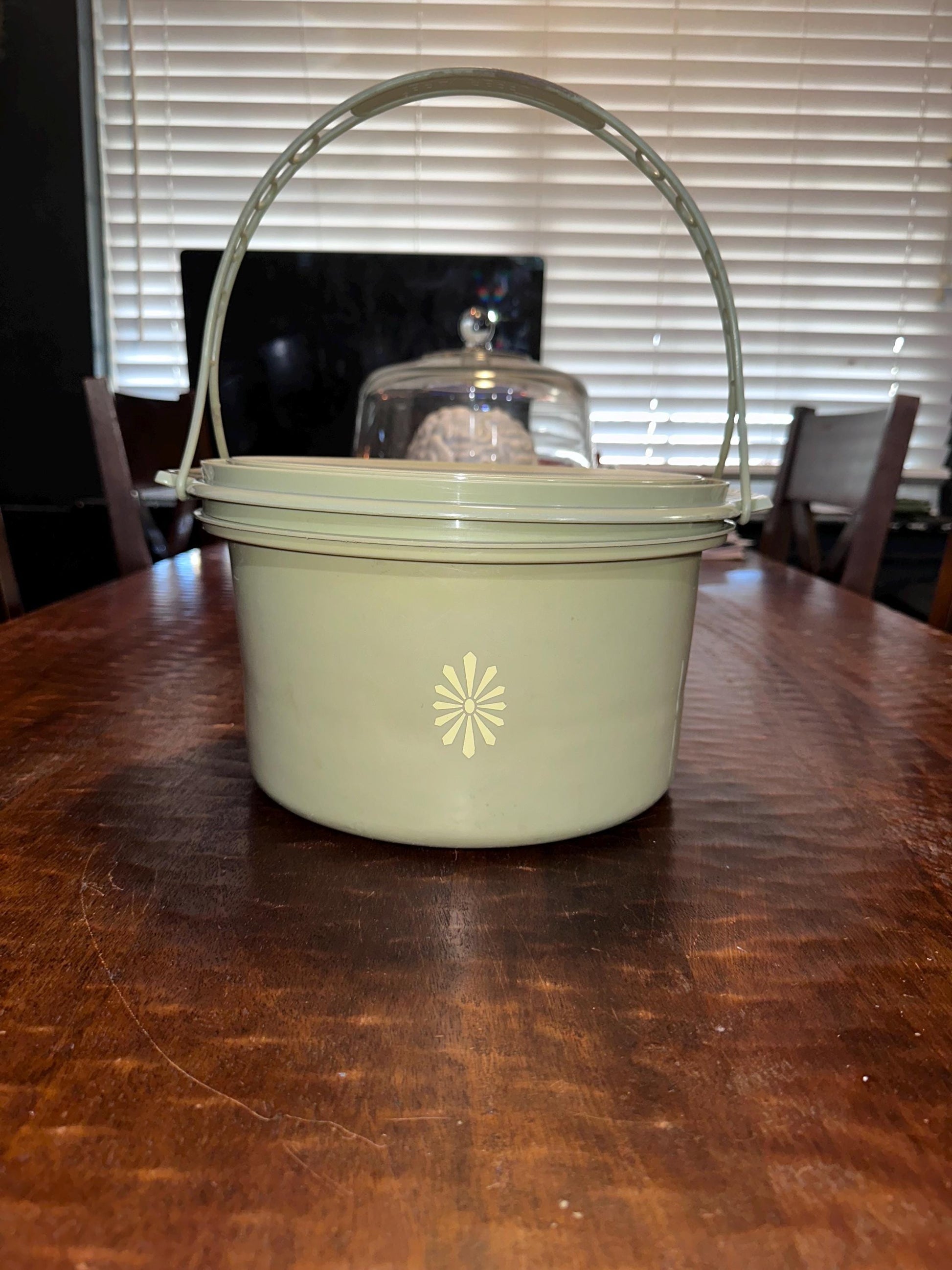 Vintage Tupperware Cake Saver and Carrier in classic avocado green. Keep your cakes fresh and transport them easily with this durable and timeless Tupperware. A must-have for any baking enthusiast looking for a practical and stylish solution. Made with high-quality materials, this cake saver will last for years to come.